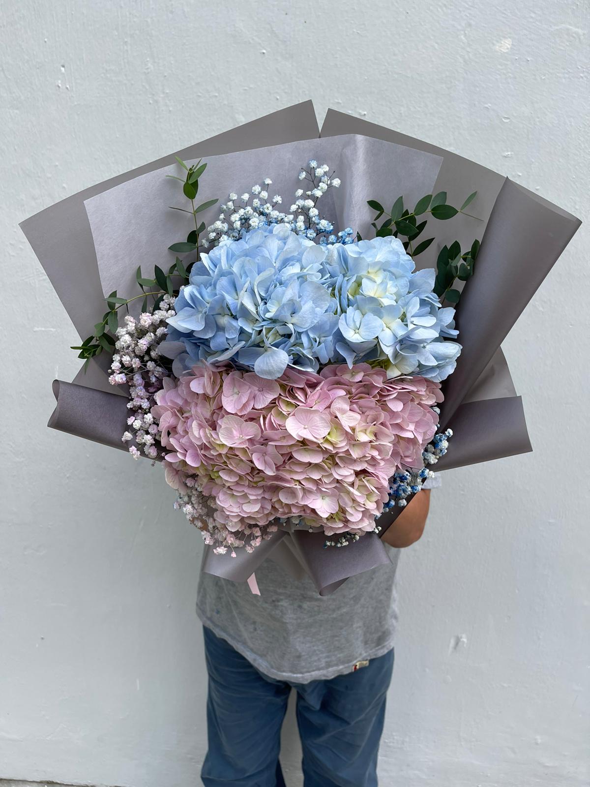 Athena is a fresh flower bouquet that includes 2 hydrangaes paired with baby breaths.